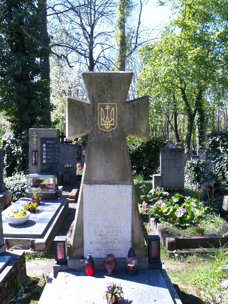 Могилу знаходимо не одразу, блукаємо між рядами… ось вона! Жива стіна з ялівцю відмежовує кілька старих могил від костелу святої Анни. На могилі великий грубо тесаний пісковик. У верхній частині пам’ятника хрест, під ним два герби: України і Великого Війська Донського. Нижче на великій плиті вирізьблено дві епітафії: українською та російськими мовами (в такий спосіб українська та донська громади віддали шану славетному старшині). Поки прибираємо на могилі до нас підходить наглядач кладовища і починає нам допомагати. Чоловік років 50-60, говорить лише чеською мовою. З його слів я зміг розібрати щось приблизно таке: «Ой, що ви! Не варто, пани! То моя робота, я зараз все приберу», – забирає з моїх рук сміття та зникає на кілька хвилин.